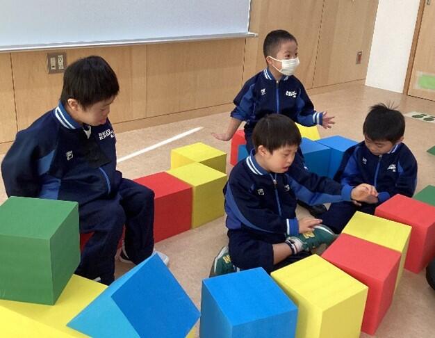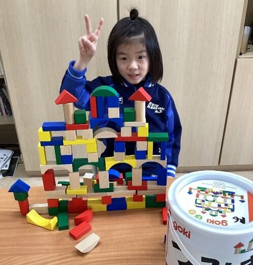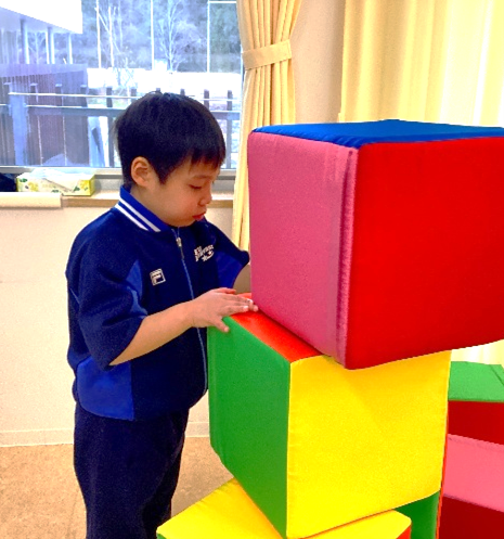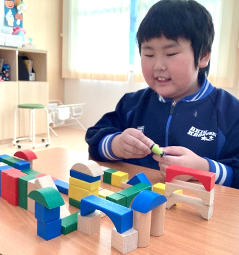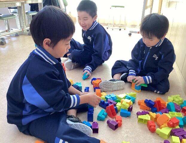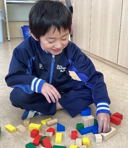 11月後半からは、「つくってあそぼう!(構成遊び)」の学習を行いました。積み木、ブロック、レゴなどを使って様々なものを作ったり組み立てたりしました。色や形の違いに気付いて、同じ形を集めて並べてみたり、高く積み上げてみたり・・・。素敵なお城を完成させたお友達もいました!みんな笑顔で楽しく活動できました。